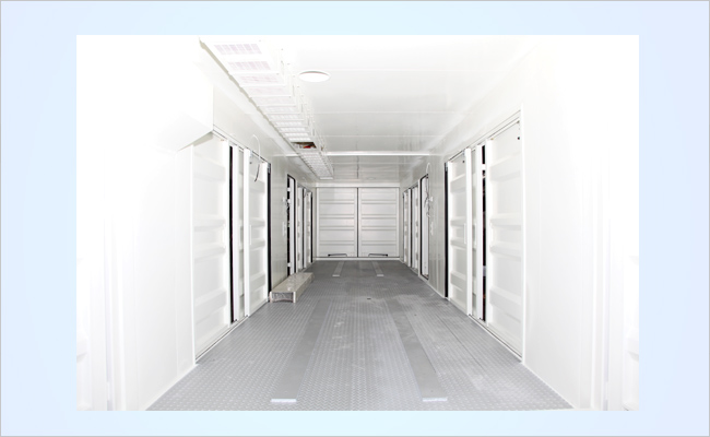 該方倉專用于油田作業(yè),為油田野外作業(yè)提供電源。方倉中裝有2臺(tái)發(fā)電機(jī)組,為了發(fā)電機(jī)組維護(hù)方便,方倉兩側(cè)各裝有6扇推拉門,為機(jī)組維護(hù)提供足夠的空間。方倉底座采用高強(qiáng)度特殊設(shè)計(jì),可適用于野外拖行作業(yè)。